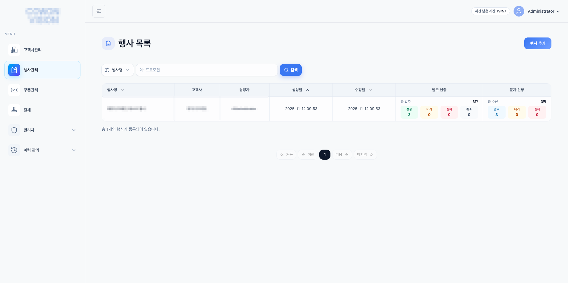 행사 단위로 발주/발송 진행 현황을 집계하고 상세 내역(주문·발송 결과)을 관리합니다.