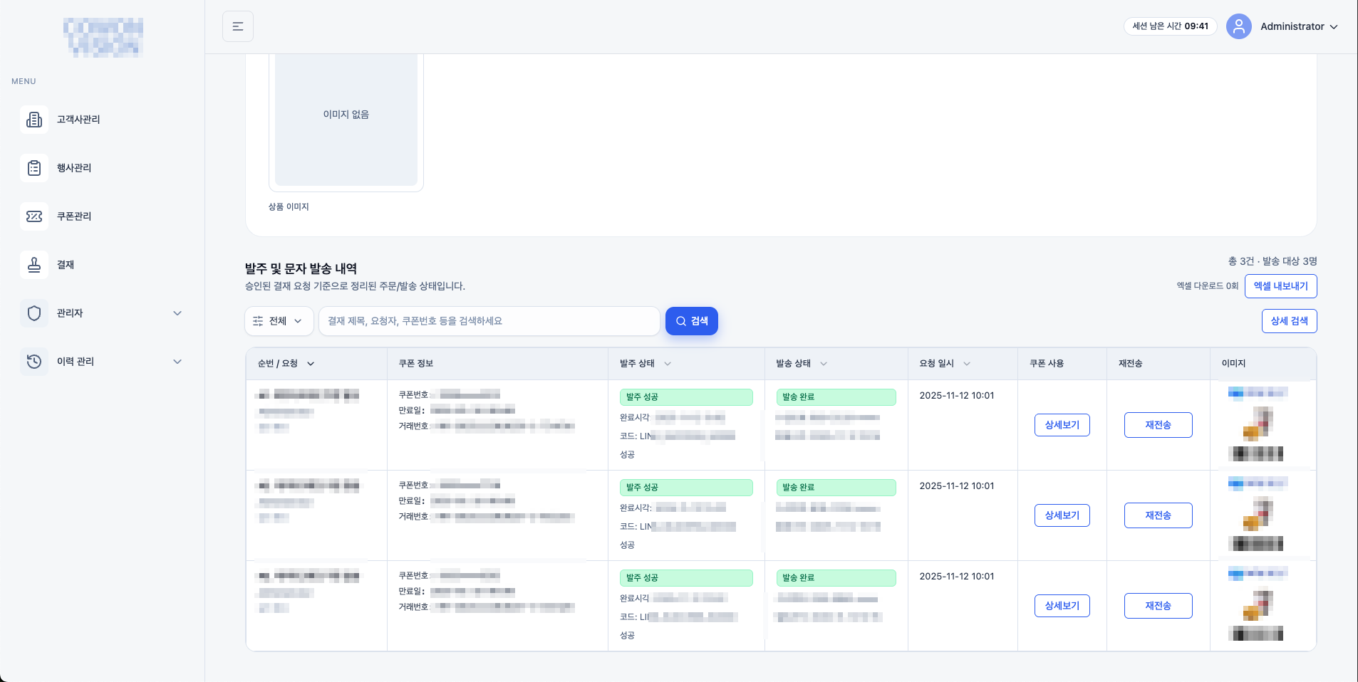 고객사(로고/문자 템플릿 등) 단위로 운영 데이터를 관리할 수 있도록 CRUD를 제공하며, 행사/주문/발송 상태를 대시보드와 상세 화면에서 실시간으로 집계·확인할 수 있게 구성했습니다. 발주 결과(쿠폰번호/유효기간/원문 응답)와 발송 결과를 수신자 단위로 추적하고, 실패 건은 개별/일괄 재발송이 가능하도록 운영 플로우를 구현했습니다.