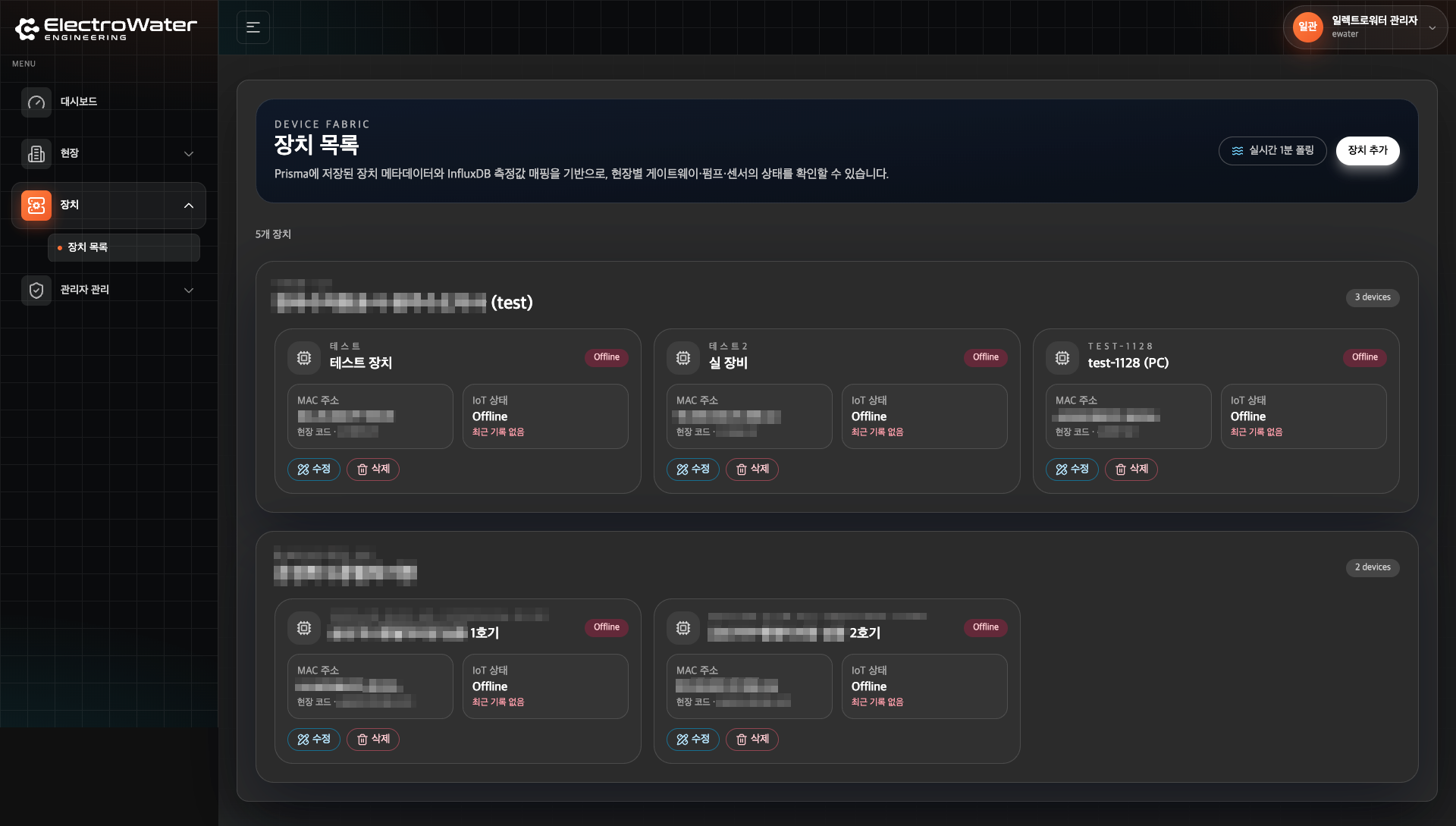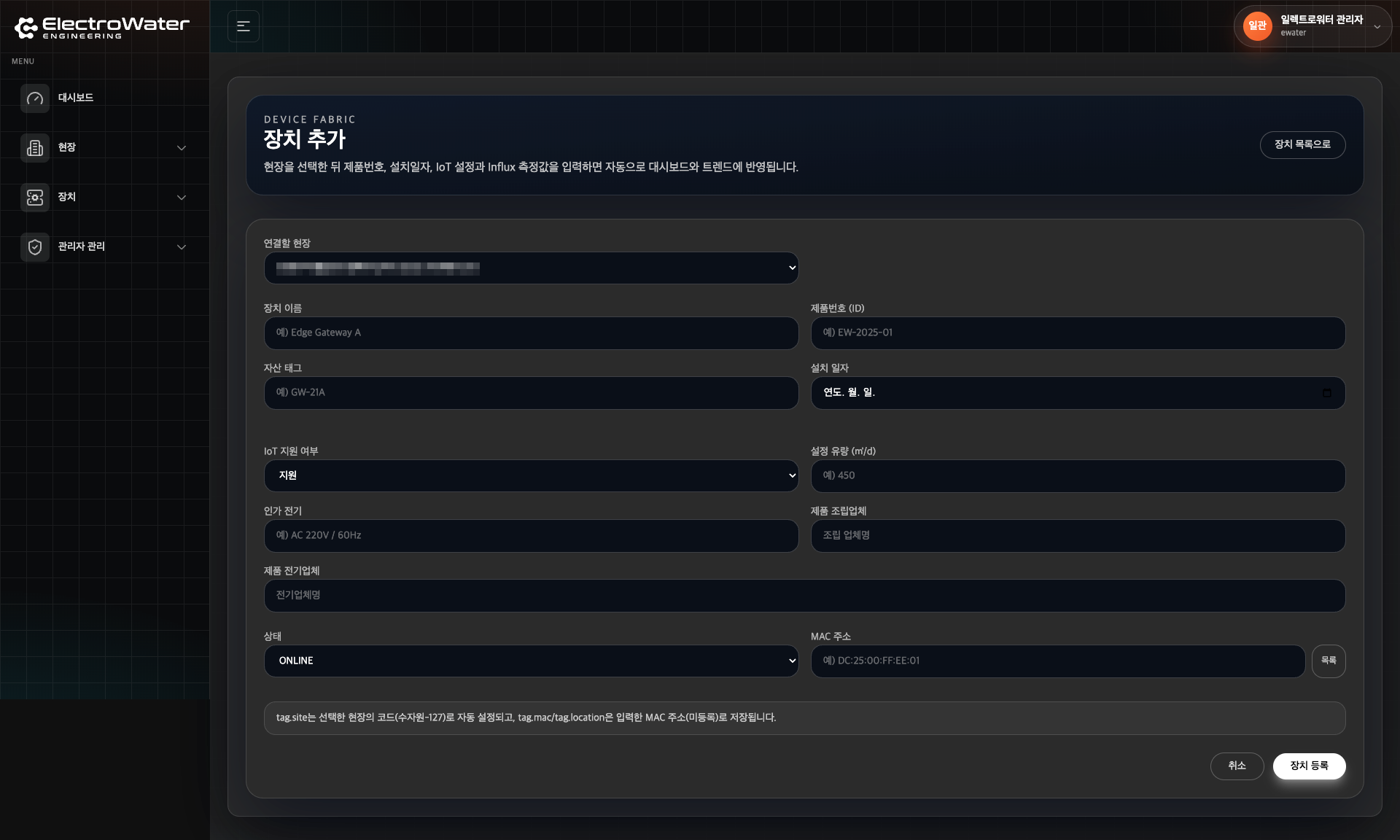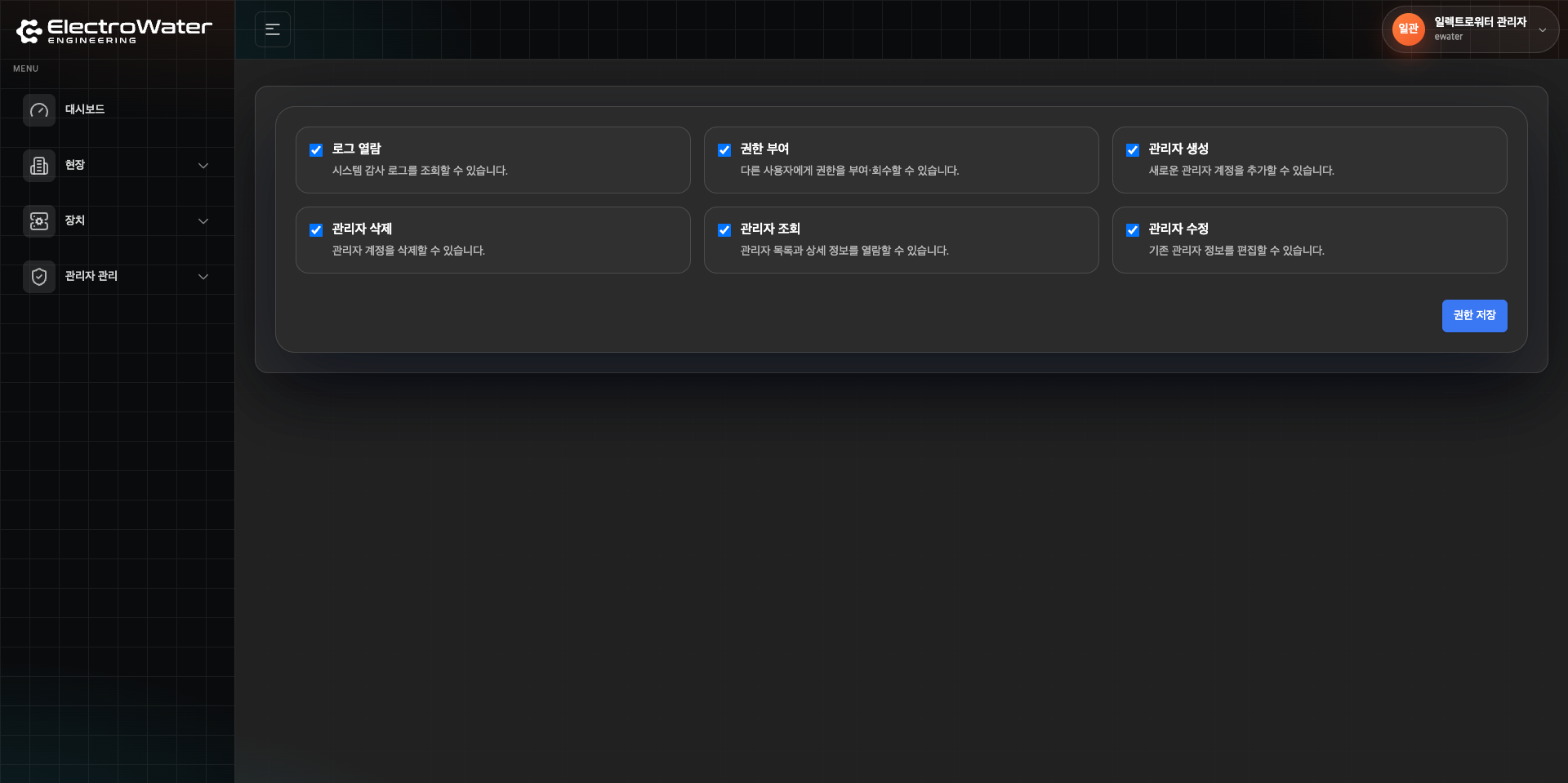 ElectroWater CMS는 전기·수처리 현장을 통합 관리하는 Next.js 15 기반 관리자 콘솔로, 인증된 세션만 접근 가능한 (admin) App Router 그룹에서 현장, 장치, 센서, 관리자 계정/권한을 한 번에 다룹니다. Prisma(MySQL) 스키마로 현장·장치·센서·권한·활동 로그를 모델링하고, Influx 텔레메트리 연동으로 장치 태그 위치 기준 최신 수집 시각을 합쳐 온라인/오프라인/주의 상